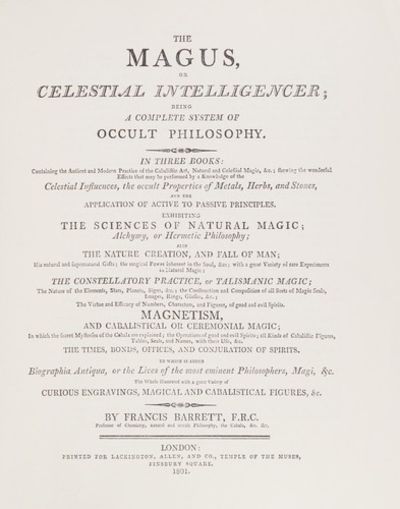 - Barrett, Francis. The Magus, or Celestial Intelligencer; Being a Complete System of Occult Philosophy. London: Lackington, Allen, and Co., 1801.